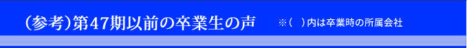 とにかく頑張りました。すみません、今回だけはまず自分に「よくやった!!」と、褒めました。自分投資の気持ちから入学し、久々に根性を発揮した思いです。お陰様で質のよい大人にさせていただき大きな財産を持ち帰れた気分です。今後は誇りを持って仕事に励む事が出来ます。皆さんありがとうございました。お礼申し上げます。 溝口惠子(大同生命) |